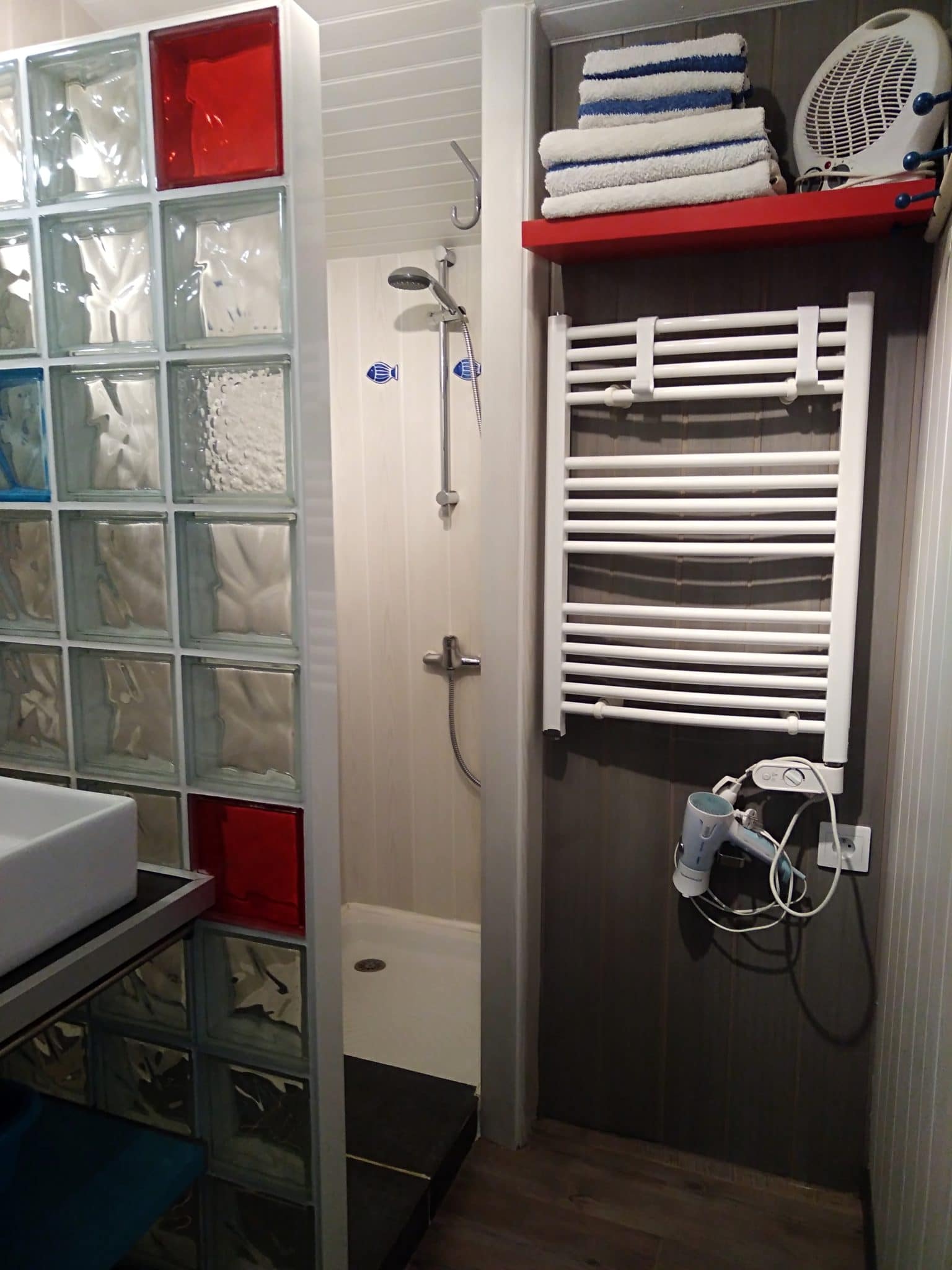 Salle de douche : Douche + vasque + Sèche-cheveux